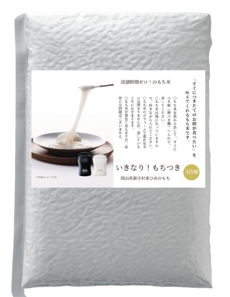 浸漬時間ゼロ! 袋から出してすぐに餅つき機に入れて、蒸す→つくができる「いきなり!もちつき」です。